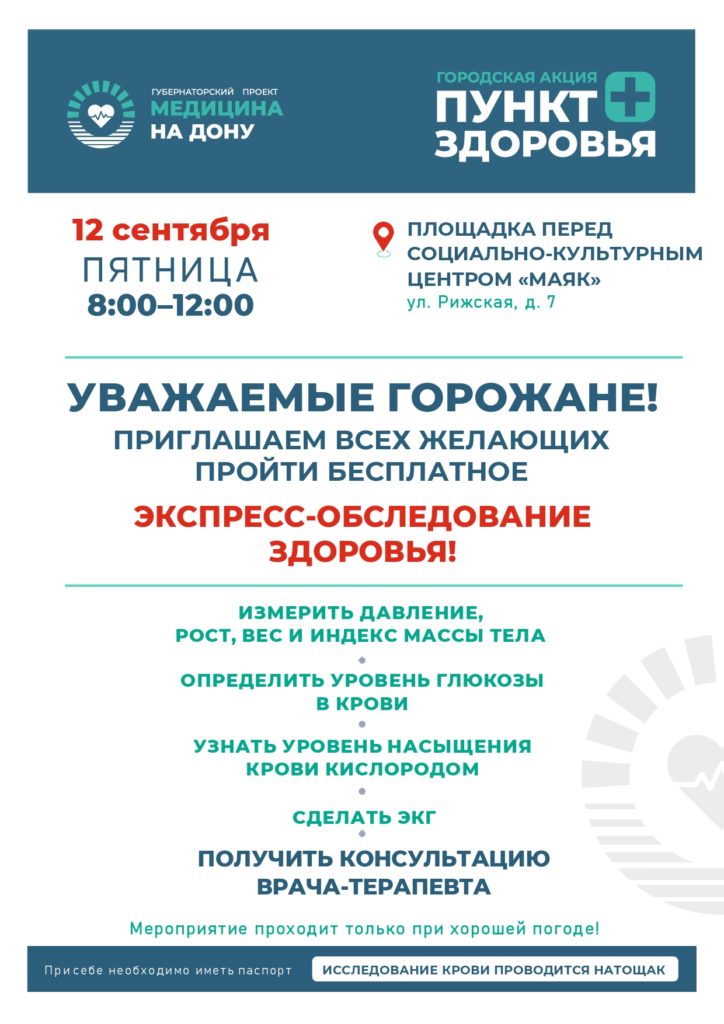 В рамках губернаторского проекта «Медицина на Дону» любой желающий сможет пройти бесплатный чекап 12 сентября с 08:00 до 12:00 на площади социально-культурного центра «Маяк»Обследование включает:
