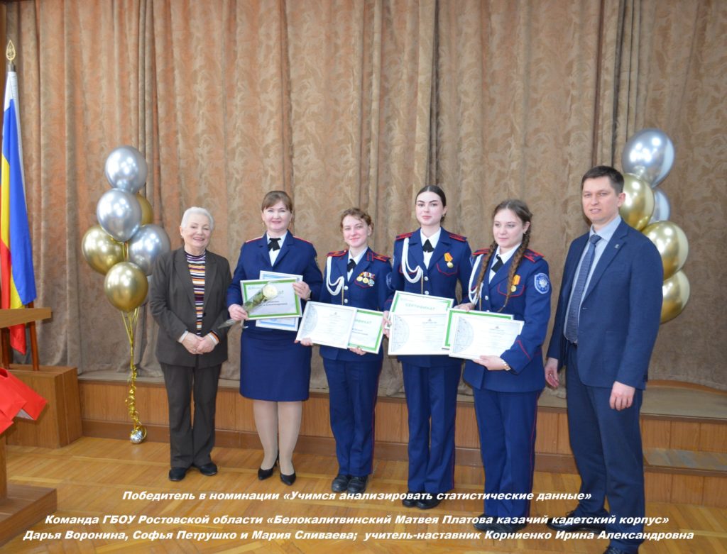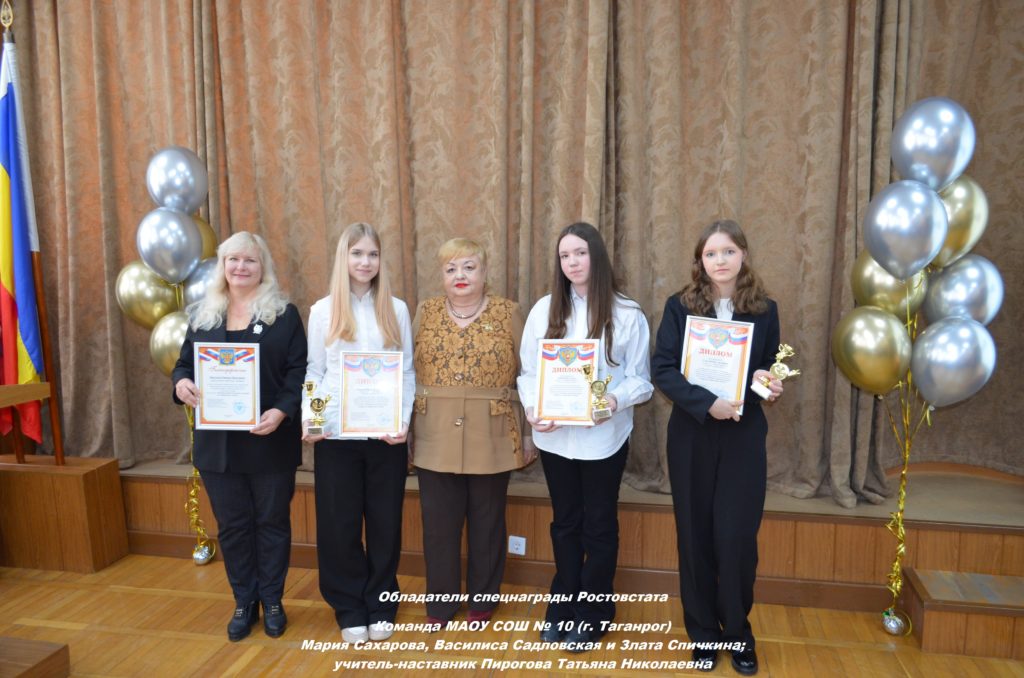 | 25 марта награждением победителей завершился региональный этап IX Всероссийского школьного конкурса по статистике «Тренд». Церемония чествования финалистов прошла в конференц-зале Территориального органа Федеральной службы государственной статистики по Ростовской области.Главными виновниками торжества стали юные авторы лучших на Дону исследований на статистическую тематику 2025/2026 учебного года. Это 18 команд школьников 7-11-х классов, чьи конкурсные работы региональное жюри признало самыми интересными. Восемь из них удостоились звания победителей и призеров. Всего в конкурсе соревновалось 108 команд из 12 городов и 28 муниципальных районов Ростовской области. Открывая церемонию награждения, руководитель Ростовстата, первый заместитель Председателя Правления Российской ассоциации статистиков, председатель регионального жюри ВШК «Тренд» Марина Самойлова дала высокую оценку результатов работы команд: «Мы гордимся вами, ребята, вашими достижениями, стремлением познать новую для вас статистическую науку. Вы не перестаете удивлять своими неординарными идеями и выводами». В выступлении отмечено, что донские школьники продолжают оставаться самыми активными участниками конкурса, что подтверждает конкурсная статистика: из 183 заявленных работ более 60% выполнены учениками нашего региона. За всё время существования ВШК «Тренд» в нем участвовала почти тысяча донских школьников, а количество конкурсных работ увеличилось в 15 раз. В успехах учеников, по словам Марины Александровны, большая заслуга учителей-наставников команд, которые «открыли для детей мир статистики, показали значение и возможности этой области знаний, помогли ребятам добиться блестящих результатов». Приветственный адрес организаторам и участникам конкурса прислал Председатель Правления Российской ассоциации статистиков, профессор Национального исследовательского университета «Высшая школа экономики» Алексей Пономаренко. Как организатор ВШК «Тренд», он отметил, что несмотря на сложные темы исследований, школьники Ростовской области успешно справились с заданиями, и донской регион снова демонстрирует высокий уровень конкурсных работ. Видеопоздравление победителям и призерам конкурса прислал заместитель Губернатора Ростовской области Андрей Фатеев, выразив уверенность, что навыки статистического мышления, приобретенные в процессе выполнения конкурсных работ, помогут в будущем достичь успехов в любой сфере деятельности. Финалистов приветствовали почетные гости заместитель министра экономического развития Ростовской области Марина Пономарева, первый заместитель министра образования Ростовской области Игорь Малиночка, директор Департамента по делам казачества и кадетских учебных заведений Ростовской области Сергей Красавин, заместитель управляющего – начальник экономического отдела Отделения по Ростовской области Южного главного управления Центрального банка Российской Федерации Светлана Перепелицына, председатель Правления ПАО КБ «Центр-инвест» Cергей Скрипка; начальник отдела «Альфа-агенты» АО «Альфа-Банк» Антон Мясоедов.Много теплых слов в адрес школьников и учителей-наставников прозвучало от руководства и профессорско-преподавательского состава Ростовского государственного экономического университета (РИНХ): заведу