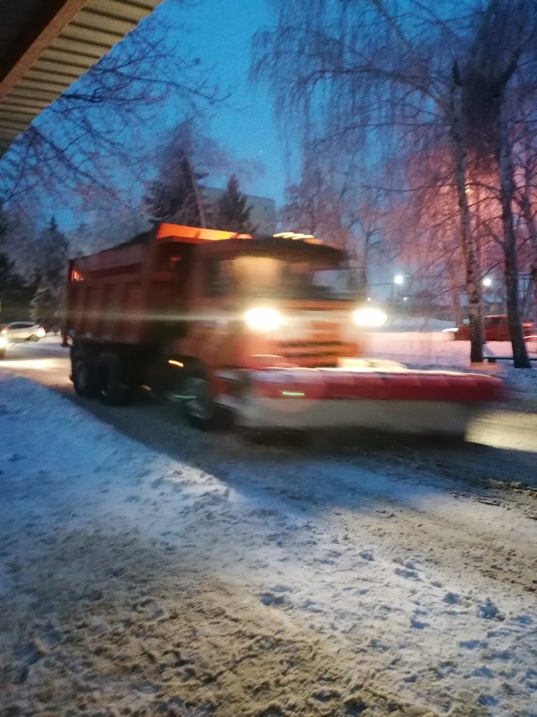 На улице Мира ранним утром ведется расчистка от снега и посыпка дорог песко-соляной смесью