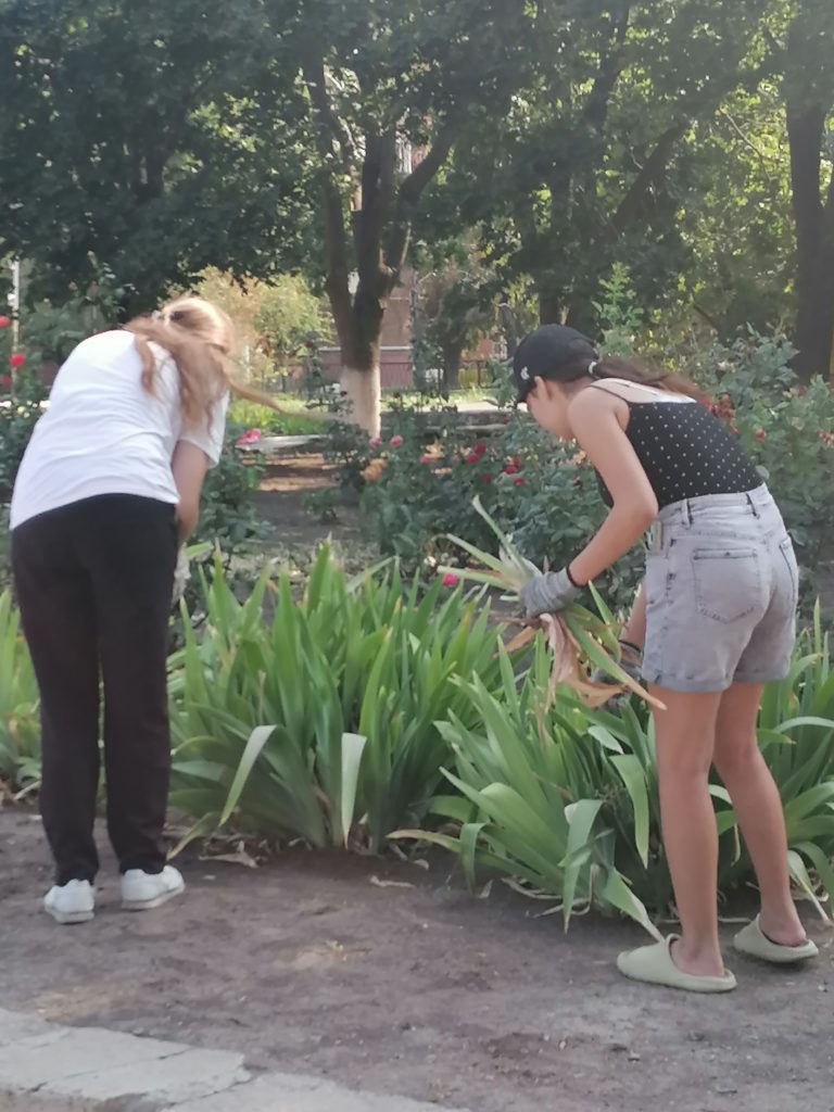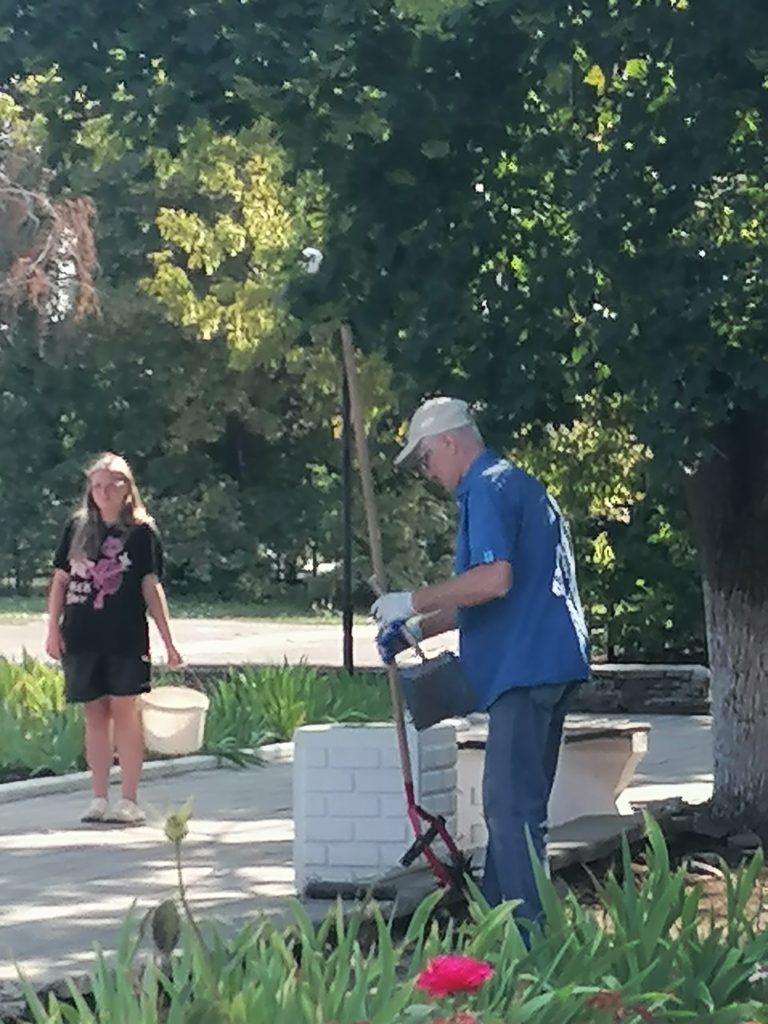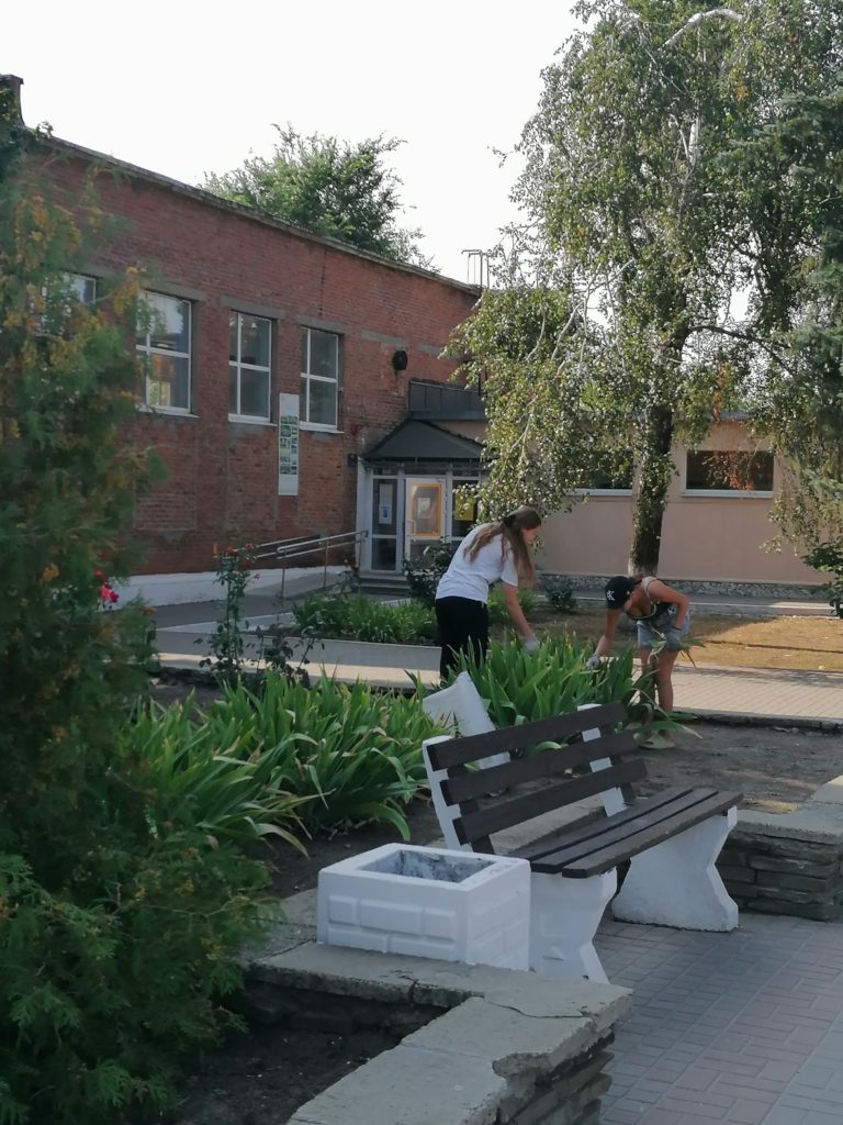 На улице Рижская работники сферы культуры приводят в порядок газоны и клумбы.