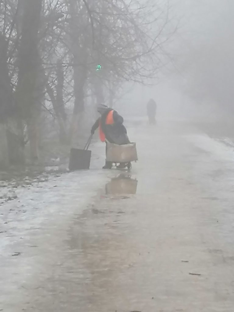 Несмотря на сильный туман и гололедицу, коммунальщики ведут сбор случайного мусора на городских улицах