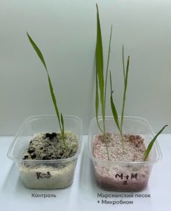 Основное назначение этого консорциума — биоремедиация, то есть восстановление свойств загрязненных человеком территорий или плодородного слоя почвы после пожаров. В лаборатории ЮФУ уже больше двух месяцев параллельно идет эксперимент по культивации этих бактерий в искусственном «марсианском» реголите из пустыни Мохаве. Уже в ноябре почва, обработанная аналогичным консорциумом, дала первую жизнь — в ней проросли всходы ячменя.