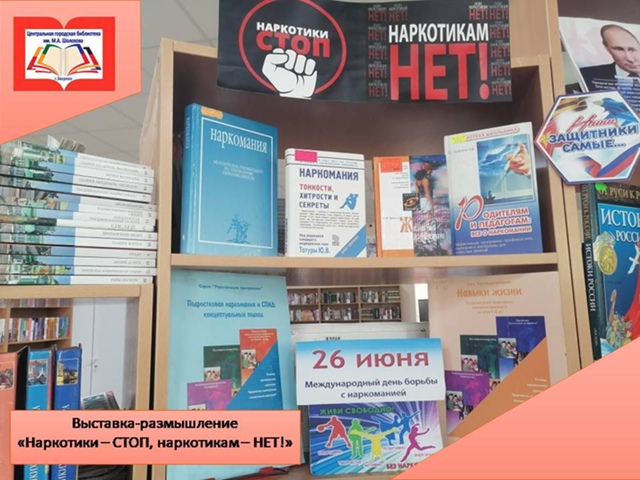 В центральной библиотеке имени М.А. Шолохова города Зверево оформлена выставка-размышление «Наркотикам – стоп. Наркотикам – нет!», посвященная Международному дню борьбы с наркоманией и незаконным оборотом наркотиков.