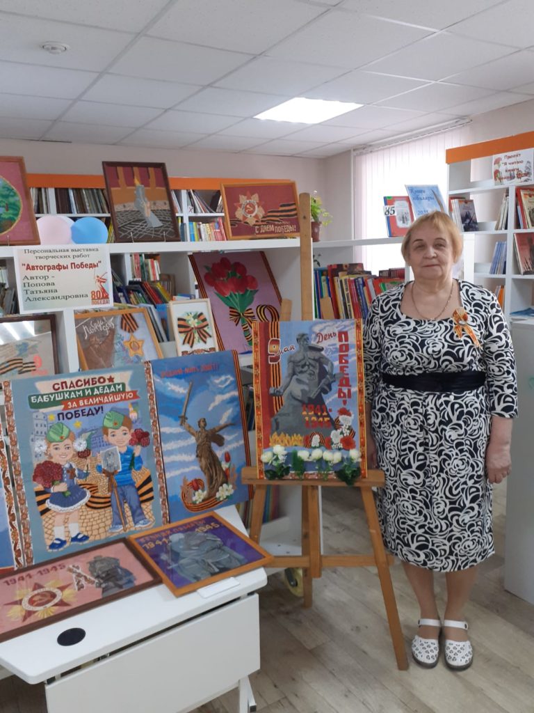 На выставке, посвященной Году защитника Отечества, 80-летию Победы в Великой Отечественной войне и Дню памяти и скорби, Татьяна Александровна представила вышитые работы. Это изображения памятников воинам Красной армии, победившим фашизм, воинских наград и военной символики. На полотнах – защитники Отечества, дети в военной форме с цветами, матери, оплакивающие своих павших в бою сыновей, белые журавли и другие сюжеты.