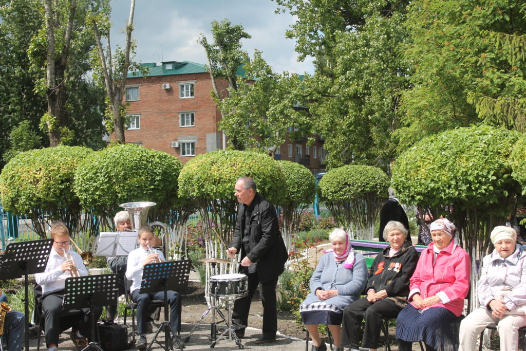 К поздравлениям присоединились ученики школы №5 имени атамана Платова, сольные исполнители и  участники духового оркестра  Детской школы искусств, которые подарили ветеранам музыкальные композиции.