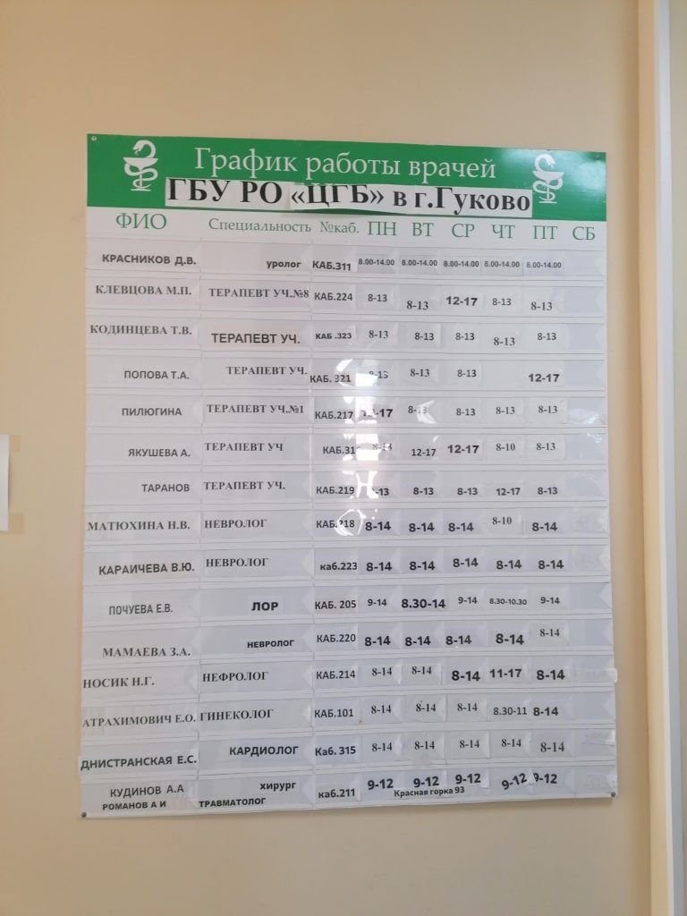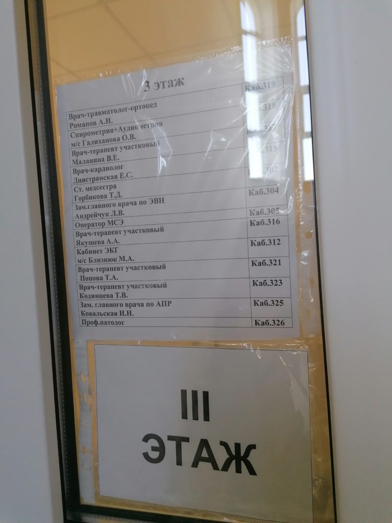 На каждом этаже вывешен список кабинетов с фамилиями врачей.