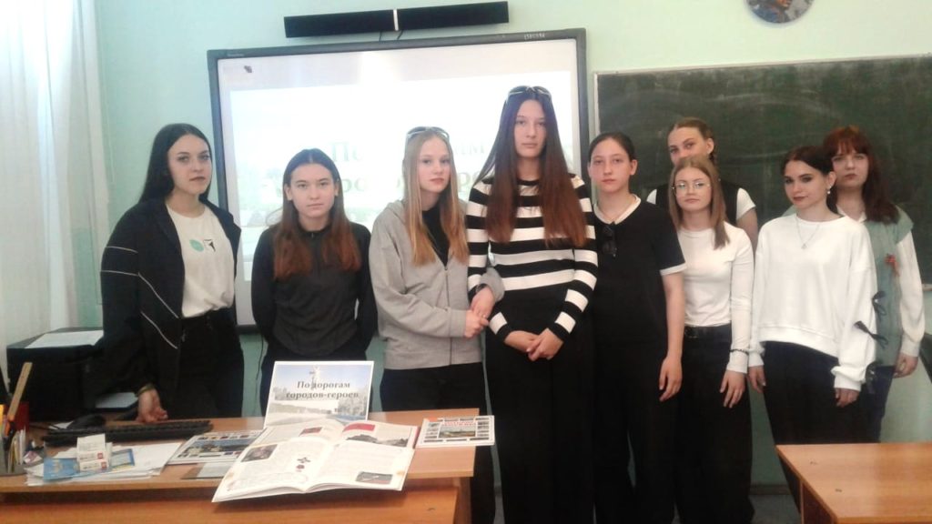 В этот день библиотекарь пункта выдачи центральной библиотеки имени Шолохова Милена Енгоян познакомила девятиклассников с историей городов, удостоенных звания «Город-герой».