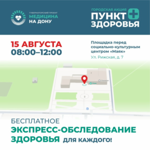 В рамках губернаторского проекта «Медицина на Дону» любой желающий сможет пройти бесплатный чекап 15 августа с 08:00 до 12:00 на площади социально-культурного центра «Маяк»Обследование включает: