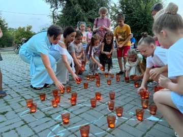 В этот день горожане зажгли свечи и почтили минутой молчания память невинных жертв войны — погибших детей в ходе боевых действий в городах и районах донбасского региона.