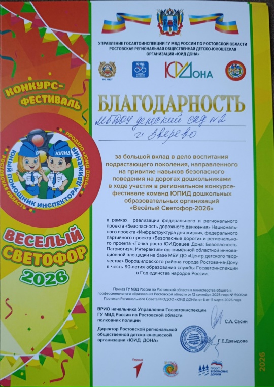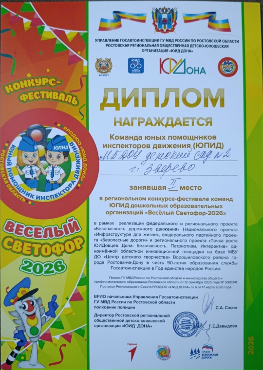 В донской столице прошел зональный этап областного фестиваля «Весёлый светофор», посвященный 90-летию Госавтоинспекции, в котором команда юных помощников инспекторов движения детского сада «Алёнушка» города Зверево заняла 2-е место.